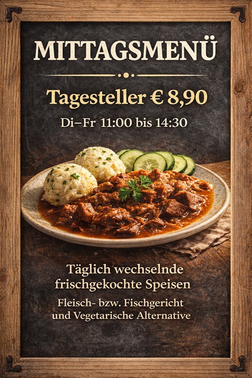 Werktags bieten wir unser täglich wechselndes, reichhaltiges und frischgekochtes Schlemmermenü zu einem besonders attraktiven Preis an: Tagesgerichte um nur € 8,90, 2Gang-Menü € 11,90, 3Gang-Menü € 13,50!